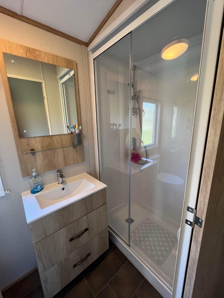 The Shower Room contains a WC, Shower, Wash basin, Large Mirror, cupboard storage space, and a heated Towel Rail.